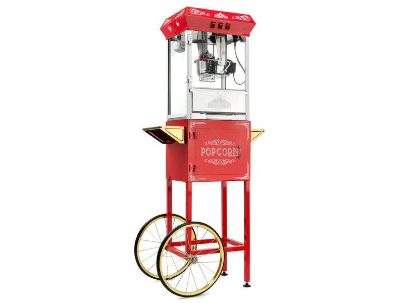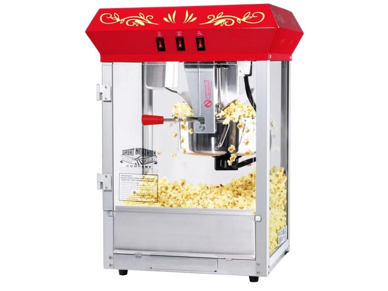 Deluxe model with 3 position control switch. Makes roughly 3-gallons of popcorn per batch. Built-in warmer light.